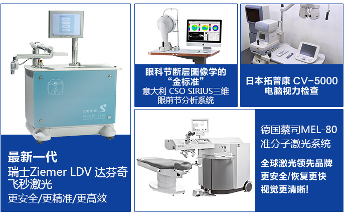 高端医疗设备同步国际技术与国际接轨,最新版的飞秒全激光近视设备——500万赫兹级瑞士 Ziemer LDV 飞秒全激光、德国蔡司MEL-80/90准分子激光系统。来自于瑞士和德国,目前世界上频率最高、最受信赖的的飞秒全激光手术设备,其综合性能全面超越目前市场上广泛使用的同类飞秒设备。