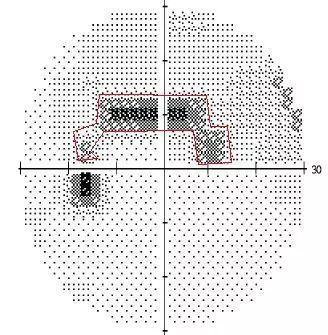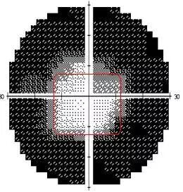 在这种情况下,需要检查医生耐心指导患者,让患者充分理解检查步骤,配合医生重新检查,这次检查后的视野图就是下图这样。