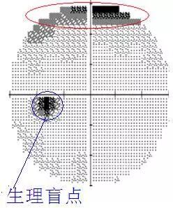 常见于上眼睑下垂或者眼镜下滑镜框遮挡部分眼球,从而导致上方视野缺损,这时需要用胶布将上睑提起重新检查。