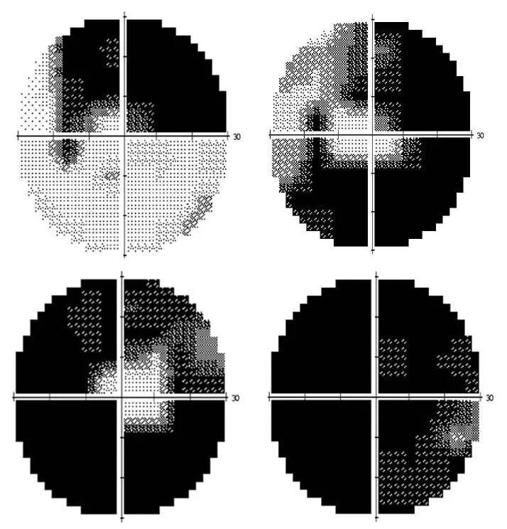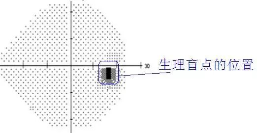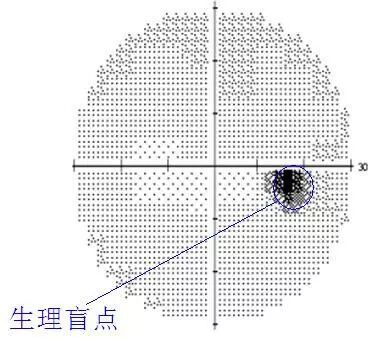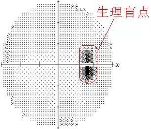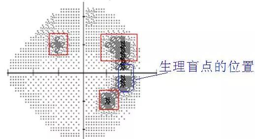 通常,第一次做视野检查的患者没有充分理解医生的意思,在检查刚开始时,看见了机器里的闪光点,但没有按按键,或者还未适应检查,没有及时按下按键,就会出现下面的视野图。