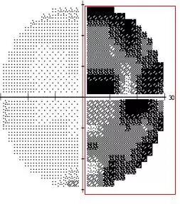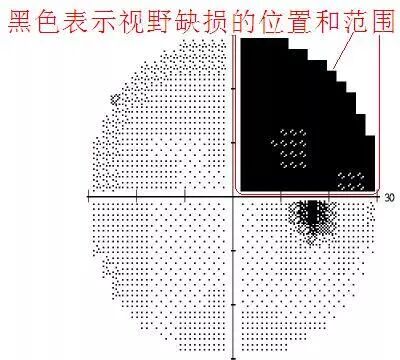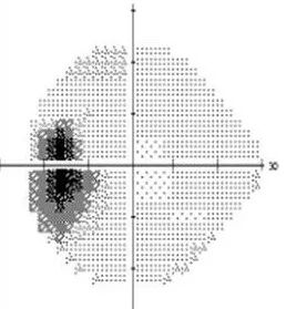 右眼,部分视野缺损的视野图及相应的视觉影像